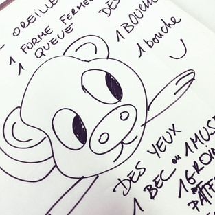 Les tables sont à nouveau rapprochées ainsi je peux faire une proposition d’arts plastiques qui correspond à certaines attentes. Il s’agit cette fois de se laisser guider et surprendre par les concignes énumérées au fur et à mesure. Un animal imaginaire apparaît...
